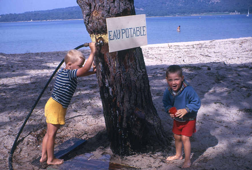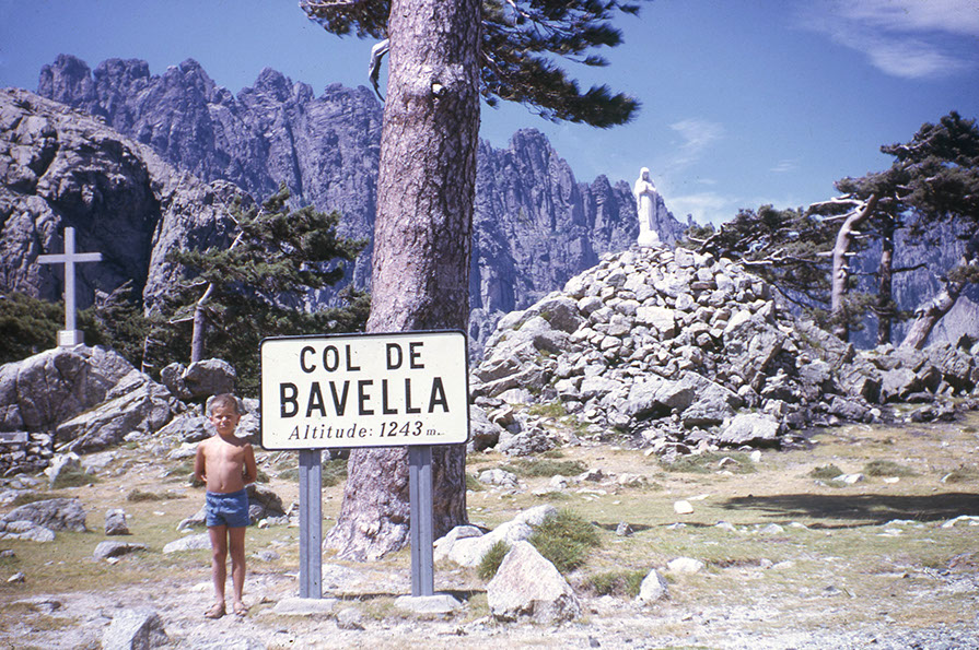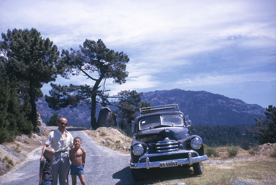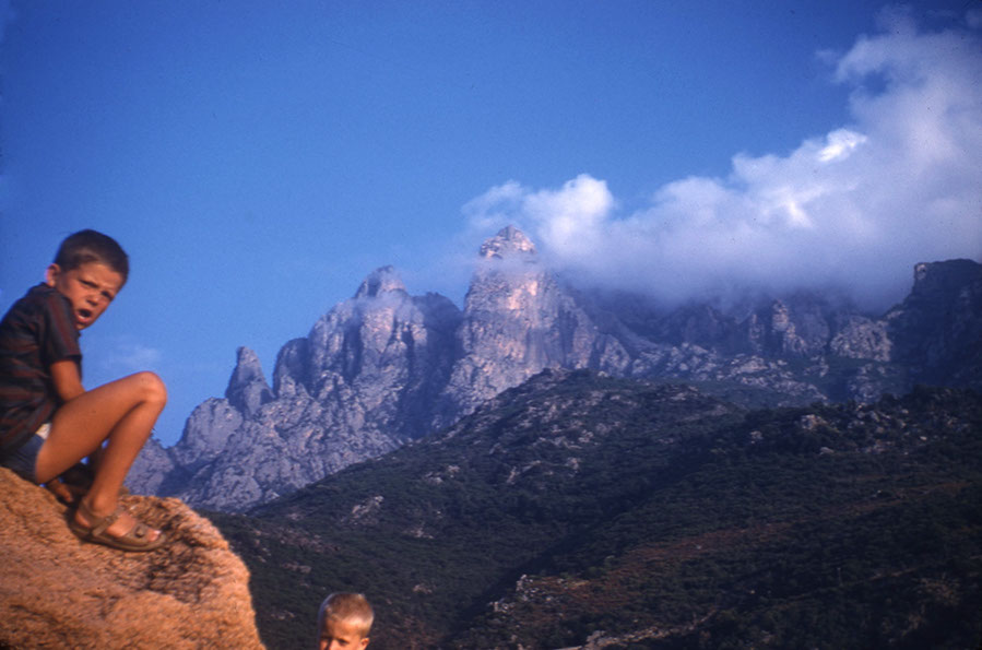 Vom langen Autofahren nach Nizza müde, legt sich Wernerli zur Überfahrt nach Korsika zur Ruhe. Am Golfo di Sogno zelten wir, zum Trink- und Badewasser muss man spurten, denn der Sand ist glühend heiss. Mit nassen Füssen kann man auf dem Rückweg bummeln. Das schwarze Auto, das uns Tante Liseli billig überlassen hatte, macht sich durch unmässige Benzinsauferei und schaukeln wie ein Schiff unbeliebt. Auf der Suche nach den berüchtigten korsischen Wildsäuen treffen wir auf dem Bavella Pass einen Räuber.